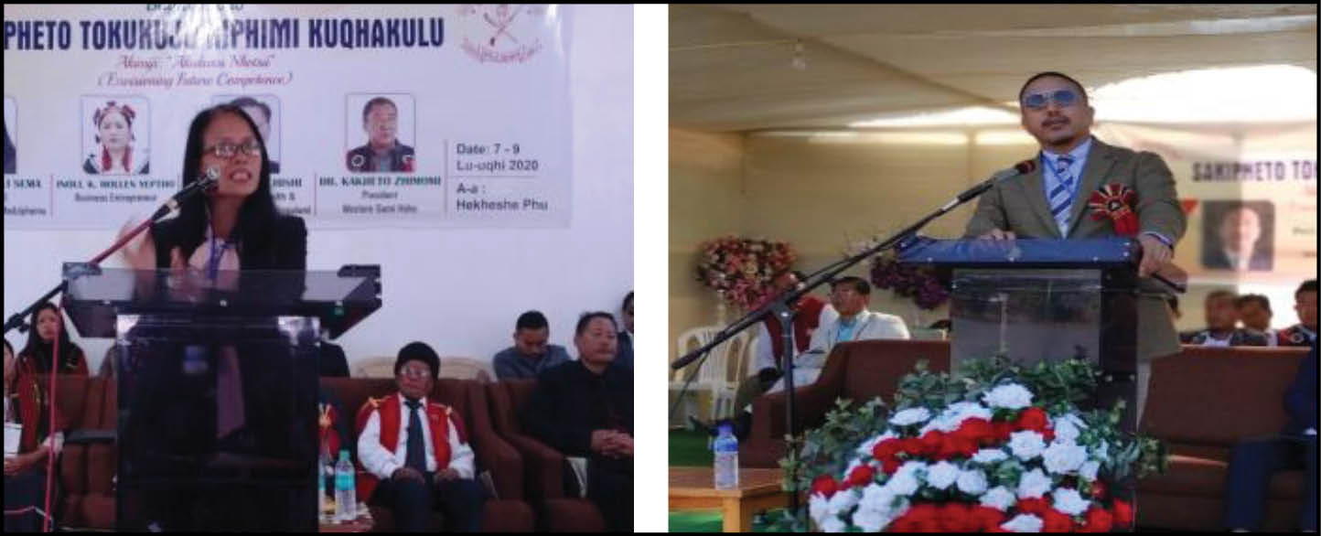 (Left) Theme Speaker Professor Dr Akali Sema, Dean SASRD Nagaland University, Medziphema addressing the students. (Right) I HimatoZhimomi, IFS addressing the congregation during the 19th general conference of S