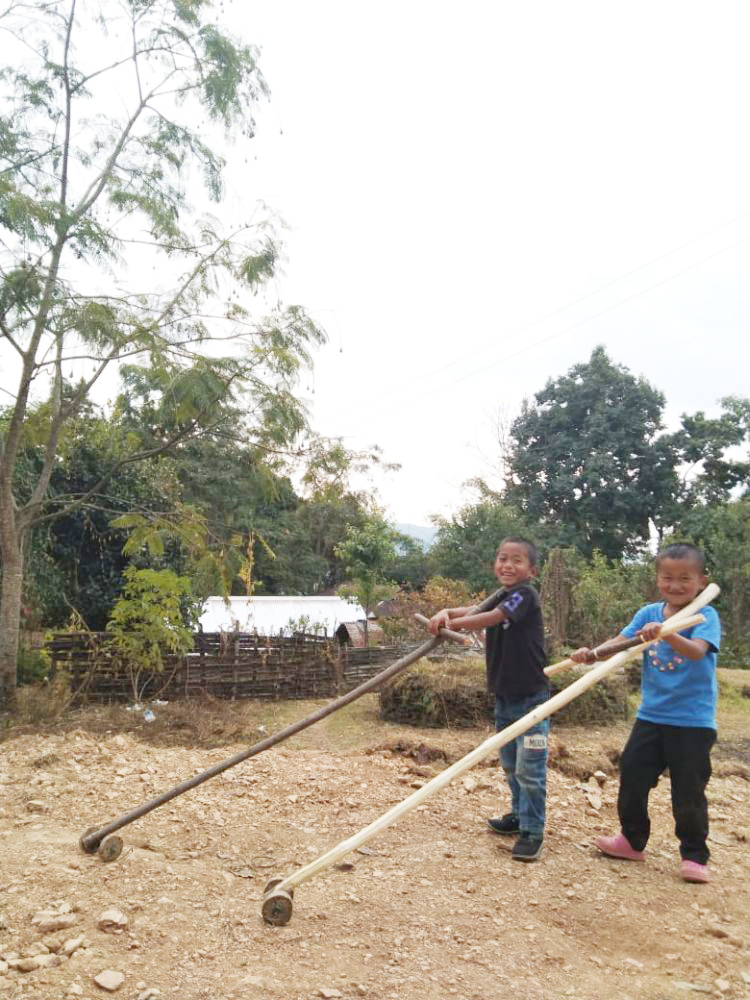 Chisholimi Village, Pughoboto: Two children are all smiles as they get ready to race their handmade cart wheel-cum-baby walk. Far from the cities, rural children in Nagaland find joy in the basics. (Morung Phot