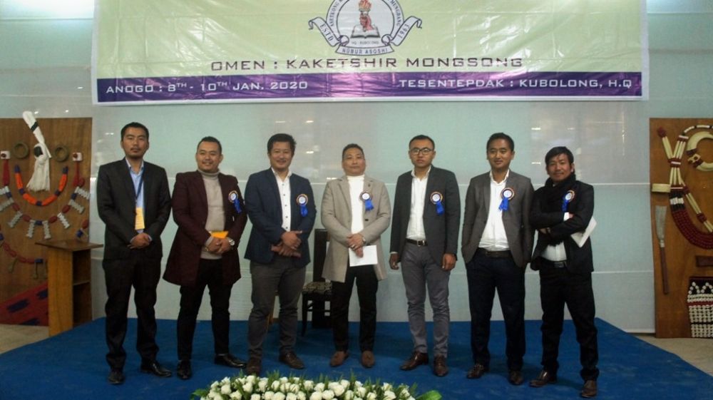 Dr. Imtiwapang Aier, center, with the presidents of Asetkong, Langpangkong, Jangpetkong, Tzürangkong, Japukong and Ongpangkong students’ unions, left to right, during the 42nd general conference of the Asetk