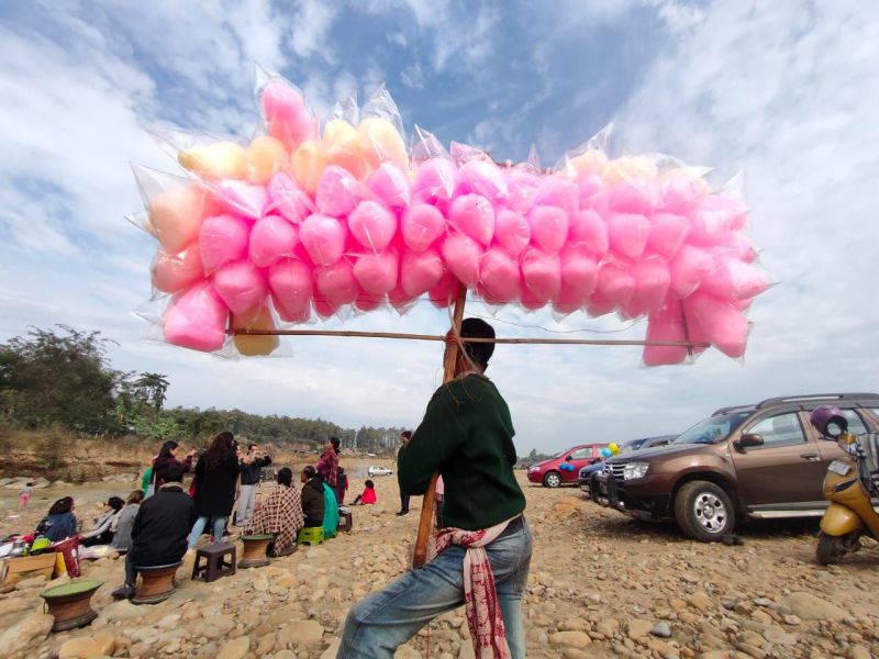 A cotton candy vendor holding pole of cotton candy bundles watches revellers celebrating New year at Chathe river at Dimapur on January 1. (Morung Photo)