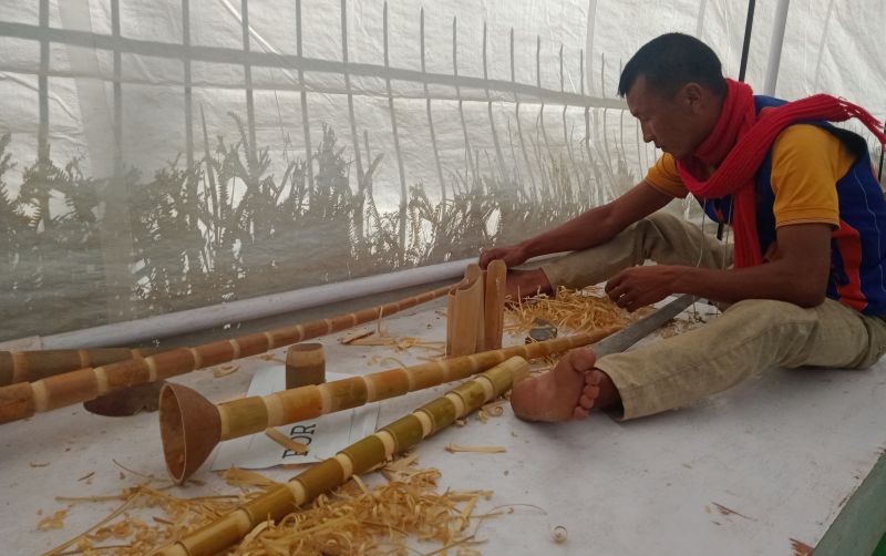 Artisan crafts Atütü, the indigenous bamboo trumpet of Pochury Nagas. A special species of bamboo is used in the making of the trumpet by the expert craftsman. The instrument is made up varying components fit