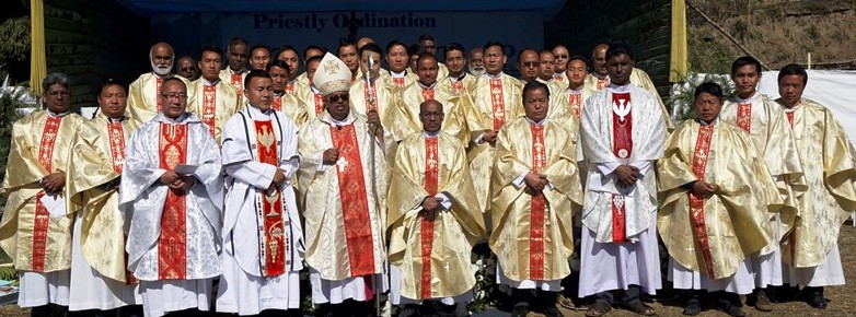 Most Rev Dr James Thoppil, Bishop of Kohima with others during ordination of the Deacon Alex Gwatilo Tep as Priest for the diocese of Kohima at Tseminyu on December 31.