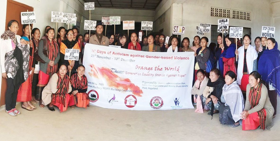 Officials and participants hold placards and banner during the observance of International day for the Elimination of Violence Against Women held at Meluri on December 6. (DIPR Photo)