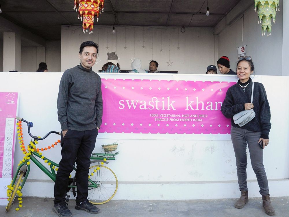 (Top) Owner of Swastik Khana, Limatola Longkumer and Vaibhav Jain (Bottom) and the owners of The Veg Trial Merangla Longkumer and Pur Longkumer at their stall in Kisama. (DIPR Photo)
