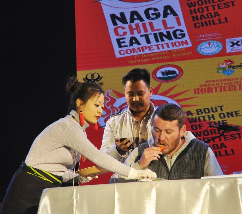 Participants during the Naga Chilli Eating Competition 2019 held at the Naga Heritage Village, Kisama on December 7. (DIPR Photo)
