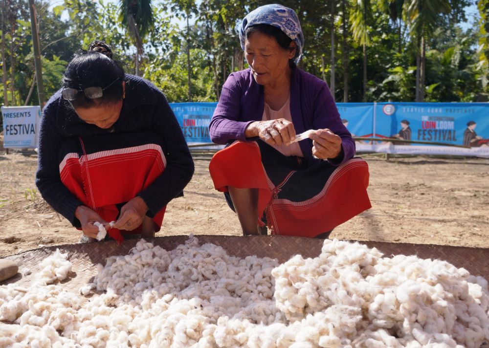Two elderly women clean raw cotton to demonstrate the primitive method of making yarn to be used for weaving at the 6th edition of the International Loinloom Festival 2019 at Diezephe craft village, 10 km away