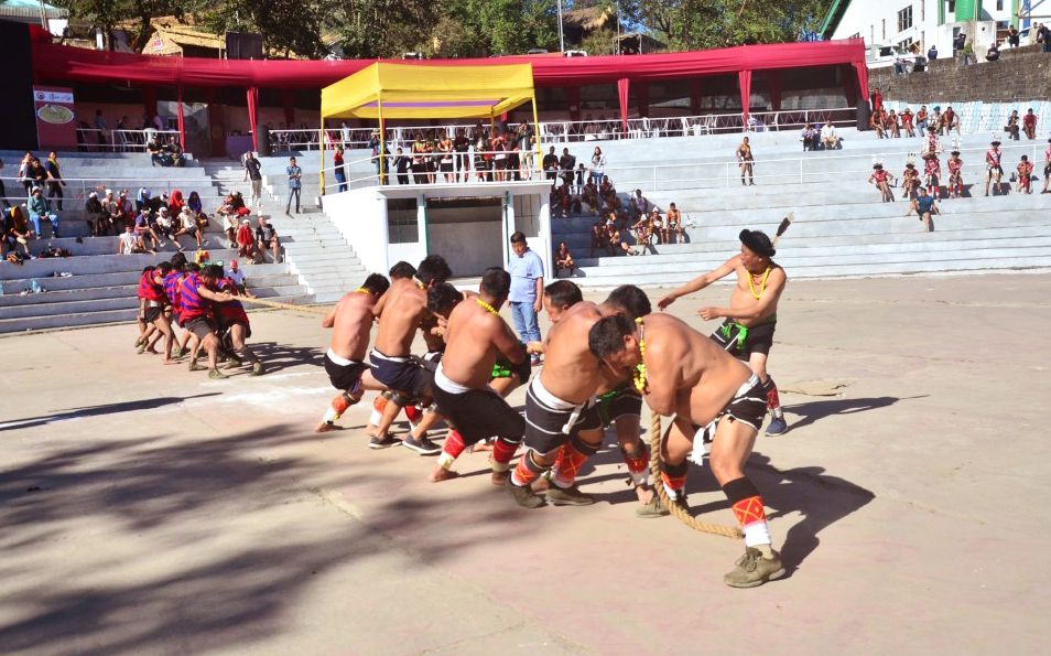Two teams competing in the tug of war game at the Amphitheatre Arena, Kisama on December 5. The Angami team emerged as the champion of Hornbill tug of war by defeating the Chakhesang team. The champions bagged