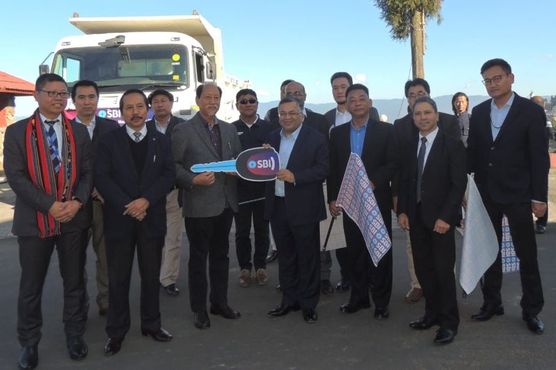 SBI officials with CM Neiphiu Rio and others during the handing over of the dumper truck to Kohima Municipal Council. SBI also donated a sum of Rs 10 lakh to the state government for the Hornbill Festival. (Mor