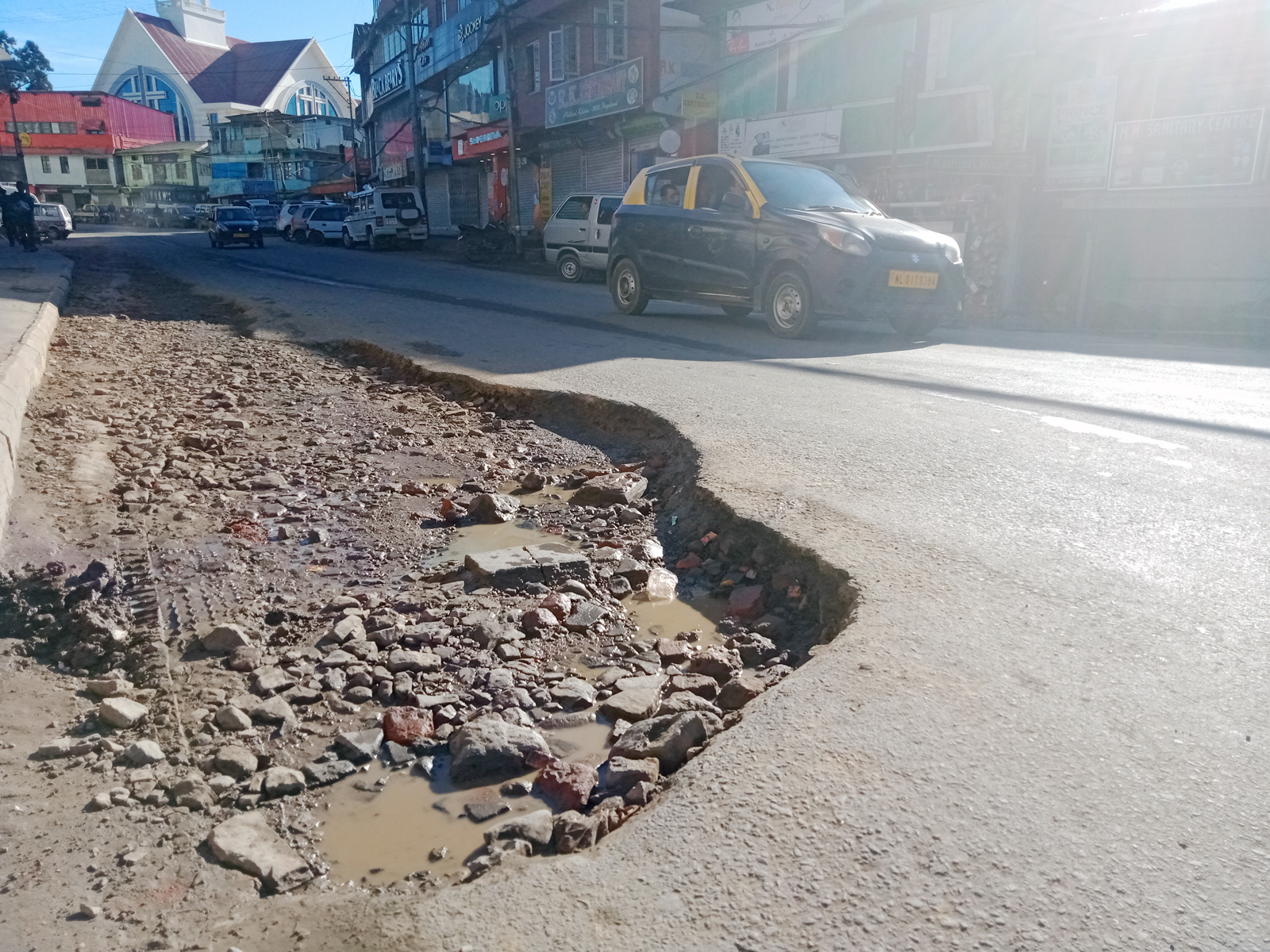 Pothole on the busy street of state capital Kohima near TCP Gate. Commuters face difficulties to counter with the condition for many weeks together. (Morung Photo by Chizokho Vero)
