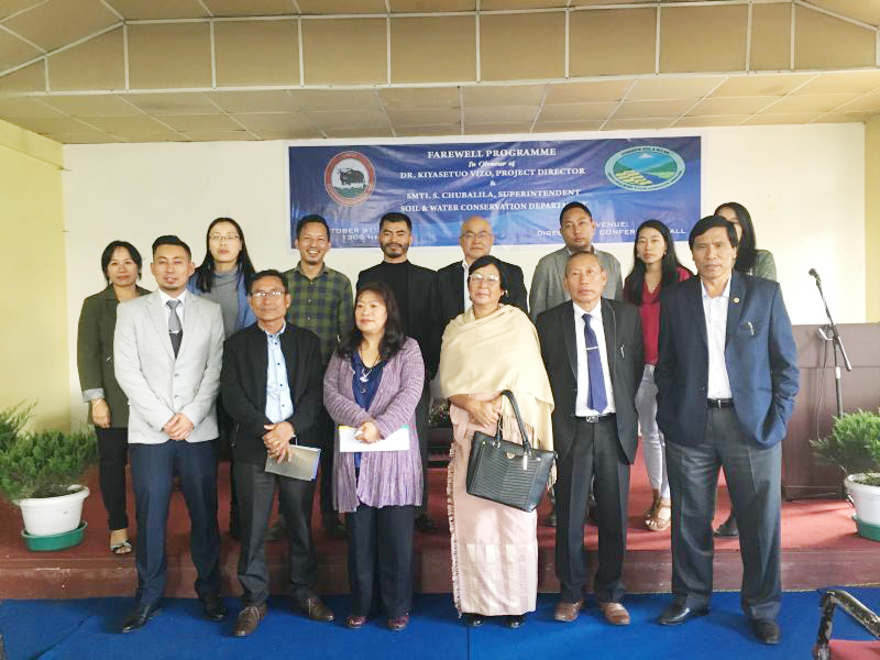 Retiring officers of Department of Soil & Water Conservation, Dr Kiyasetuo Vizo, Project Director and S Chubalila, Superintendent with others after the farewell programme held on October 31.