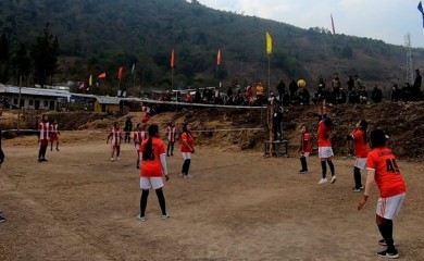 Players in action during a friendly volleyball match organised by the Kiphire Battalion of Assam Rifles under the aegis of HQ IGAR (North) in Longmatre, Kiphire district, \on March 3. The friendly match was org