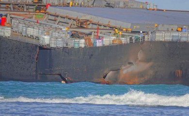 A Japanese bulk carrier that ran aground on a reef in Mauritius last month threatening a marine ecological disaster around the Indian Ocean island has broken apart, authorities said on Saturday.