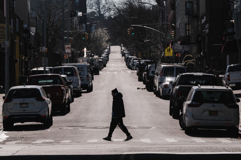 A man walks along 3rd avenue in the Brooklyn borough of New York City, U.S., March 26, 2020. REUTERS/Stephen Yang