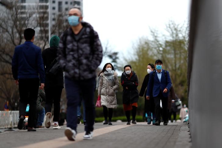 People wearing masks cross a street during after work rush hour, as businesses start returning to their normal routine following the new coronavirus disease (COVID-19) outbreak, in Beijing, China, March 26, 202