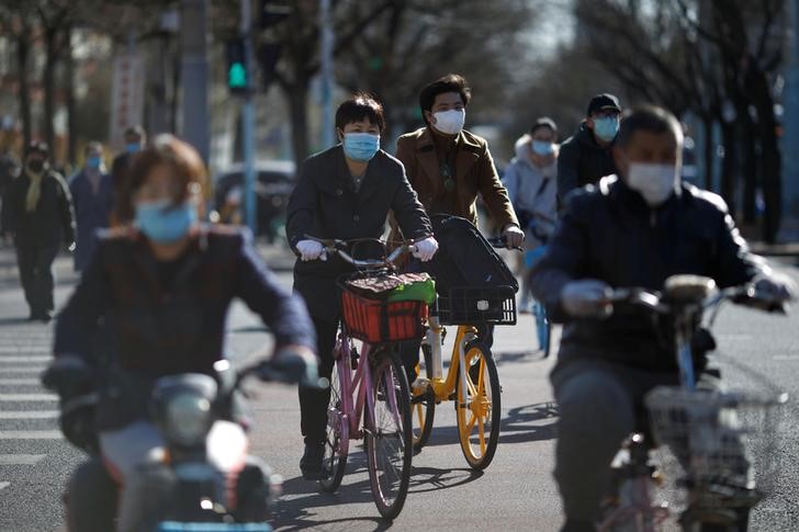 People wearing face masks ride bikes following an outbreak of the coronavirus disease (COVID-19), in Beijing, China March 27, 2020. REUTERS/Carlos Garcia Rawlins