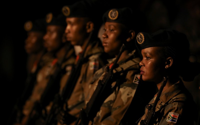 Members of the South African National Defence Force (SANDF) look on before their deployment ahead of a nationwide lockdown for 21-days to try to contain the coronavirus disease (COVID-19) outbreak, in Johannesb
