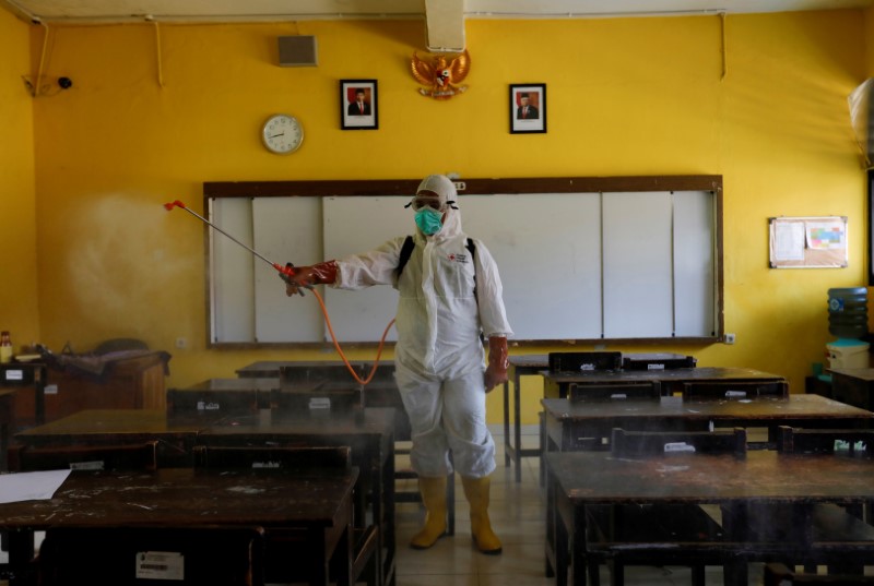 A volunteer from Indonesia's Red Cross wearing a protective suit sprays disinfectant inside the classroom of a school closed amid the spread of coronavirus (COVID-19) in Jakarta, Indonesia on March 16, 202