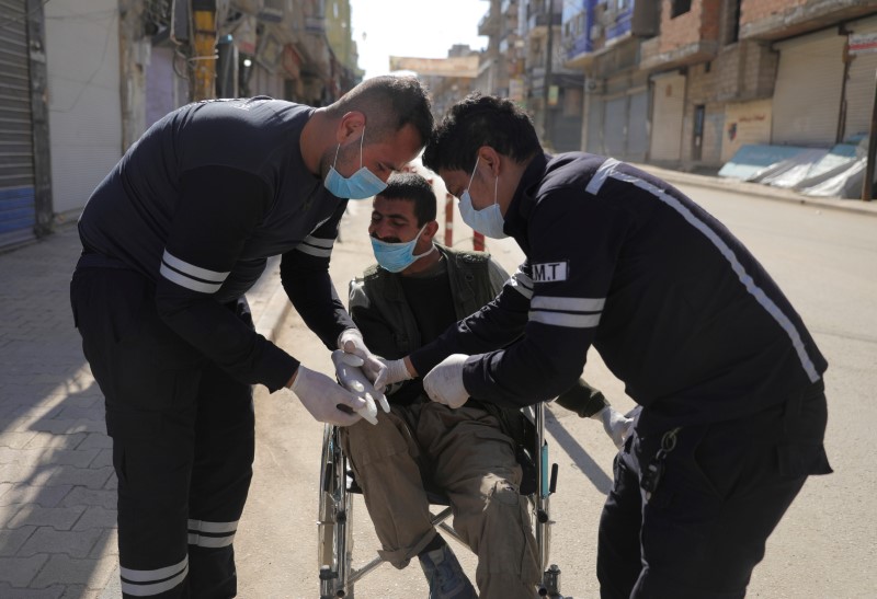 Health workers put gloves on a man in a wheelchair along an empty street, as restrictions are imposed as measure to prevent the spread of the coronavirus disease (COVID-19) in Qamishli, Syria on March 23, 2020.
