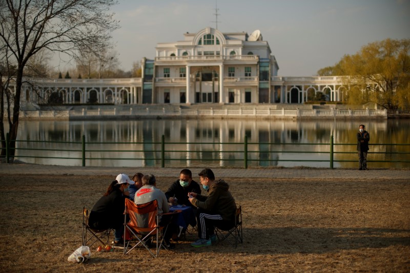 People wearing protective masks play cards in a park on a sunny day in Beijing as the country is hit by an outbreak of the novel coronavirus disease (COVID-19), China, March 21, 2020. REUTERS/Thomas Pete