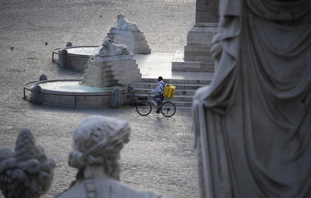 A delivery man on a bicycle is seen crossing the deserted Piazza del Popolo while the Italians stay at home as part of a lockdown against the spread of coronavirus disease (COVID-19) in Rome, Italy March 22, 20