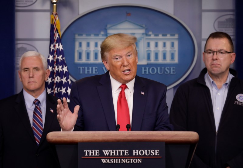 U.S. President Donald Trump, flanked by U.S. Vice President Mike Pence and FEMA Administrator Pete Gaynor, speaks during a news conference, amid the coronavirus disease (COVID-19) outbreak, in Washington D.C.,