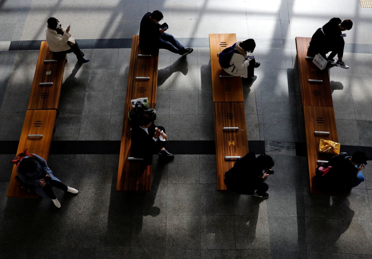 Passengers having distance to each other, following an outbreak of coronavirus disease (COVID-19), sit on benches at a lobby of a railway station in Daegu, South Korea March 13, 2020. REUTERS/Kim Kyung-Hoon