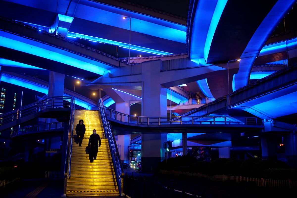 People wearing protective face masks are seen on an overpass seen following an outbreak of coronavirus (COVID-19), in downtown Shanghai, China March 13, 2020. REUTERS/Aly Song