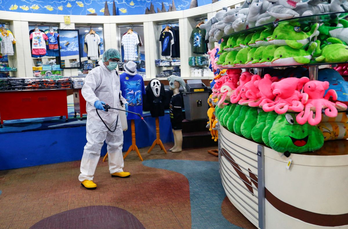 A worker wearing protective suit sprays disinfectant in Sea World, amid the coronavirus disease (COVID-19) outbreak in Jakarta, Indonesia, March 14, 2020. REUTERS/Ajeng Dinar Ulfiana
