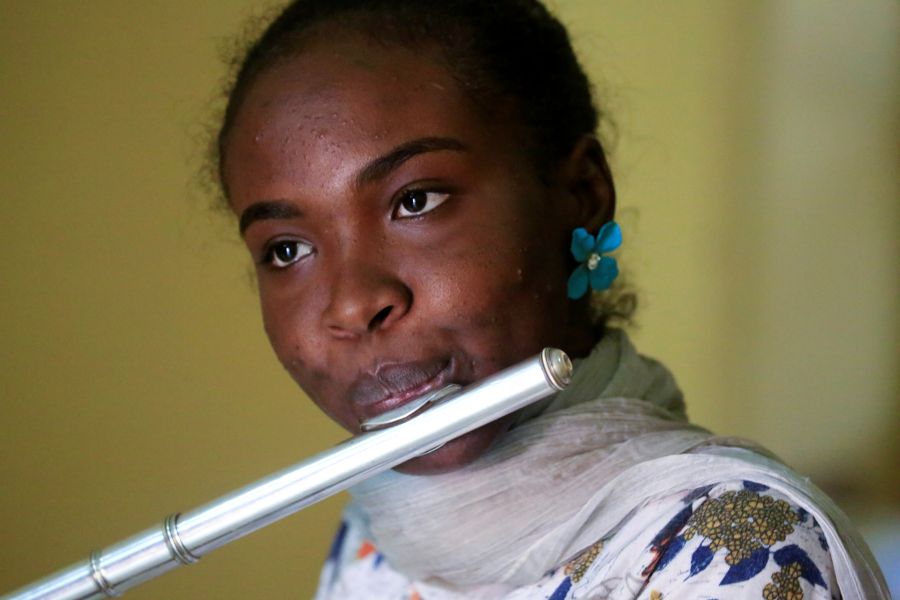 Flute player Someya Salah Abdulhai plays music in a studio at the Faculty of Music and Drama in the University of Sudan in Khartoum, Sudan on March 14, 2020. (REUTERS Photo)