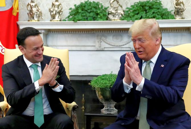 US President Donald Trump and Ireland's Prime Minister Taoiseach Leo Varadkar greet each other with 'namaste in the Oval Office of the White House in Washington, DC. Photograph: Leah Millis/Reuters