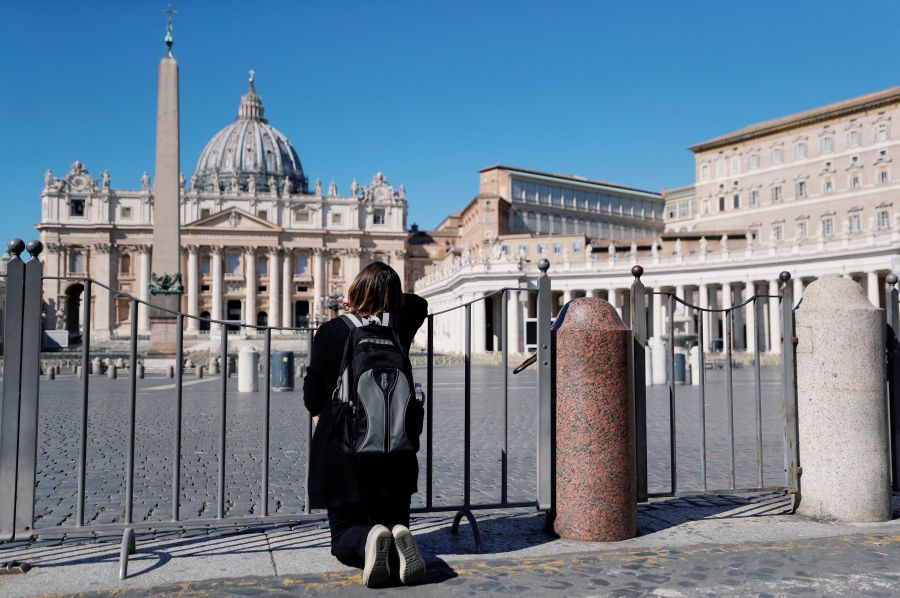 A woman prays on her knees in front of an empty St. Peter's Square as Pope Francis gives his weekly general audience via transmitted video a day after the Vatican closed the square and Basilica due to coronavir