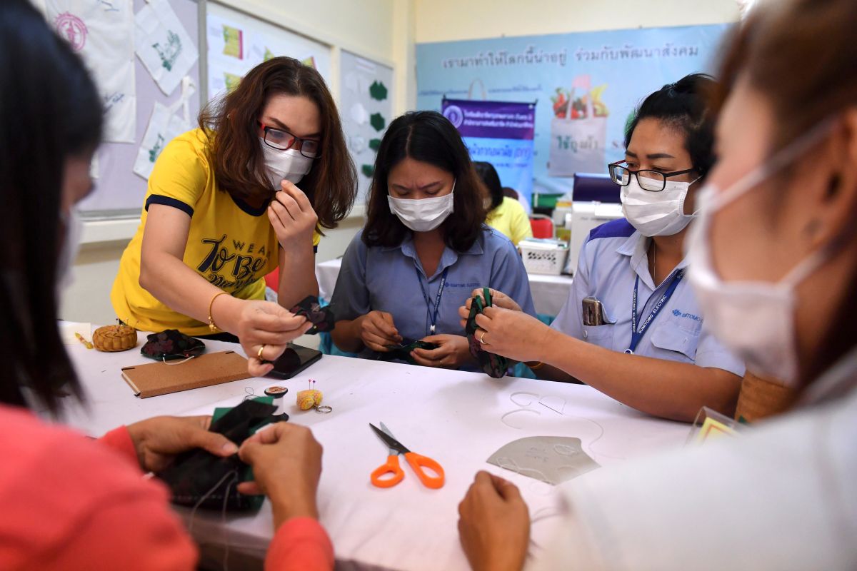 Women take part in a workshop to learn how to make face masks to protect against coronavirus in Bangkok, Thailand March 9, 2020. Picture taken March 9, 2020. REUTERS/Chalinee Thirasupa