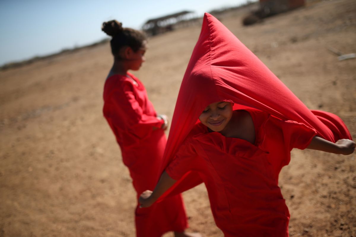 A Colombian girl from the indigenous Wayuu tribe, plays with her tunic in the wind, before perfoming a dance called Yonna, in Castilletes, Colombia February 19, 2020. REUTERS/Luisa Gonzalez/Files