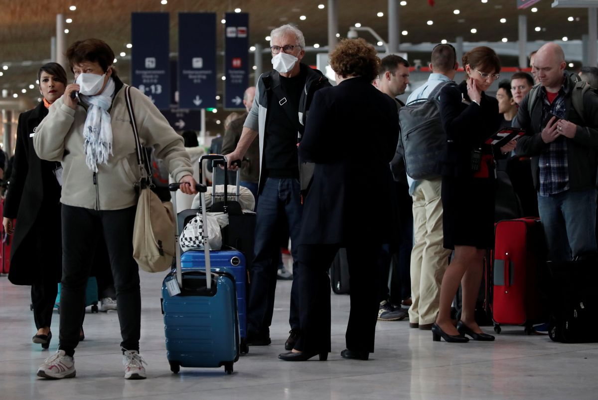 Travellers wearing protective face masks ask for information inside Terminal 2E at Paris Charles de Gaulle airport in Roissy, after the U.S. banned travel from Europe, as France grapples with an outbreak of cor