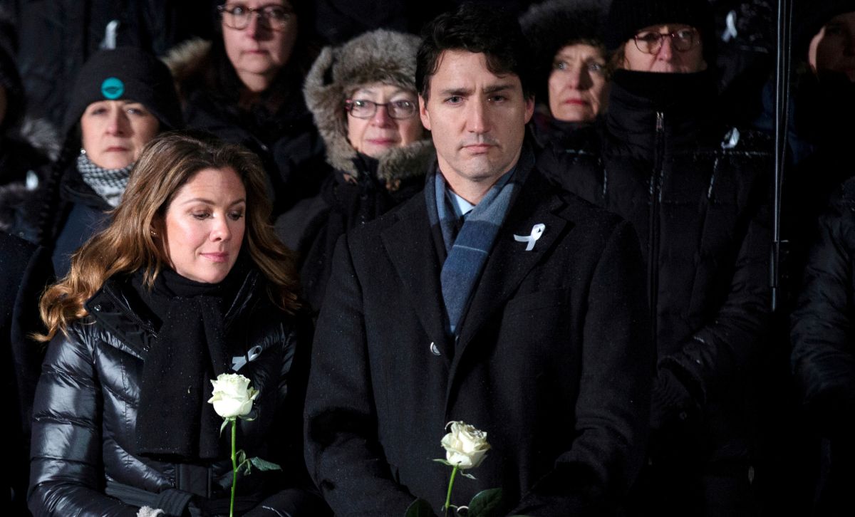 Canada's Prime Minister Justin Trudeau and his wife Sophie Gregoire Trudeau hold white roses as they attend a vigil on top of Mount Royal marking the thirtieth anniversary of the mass shooting at Ecole Polytech