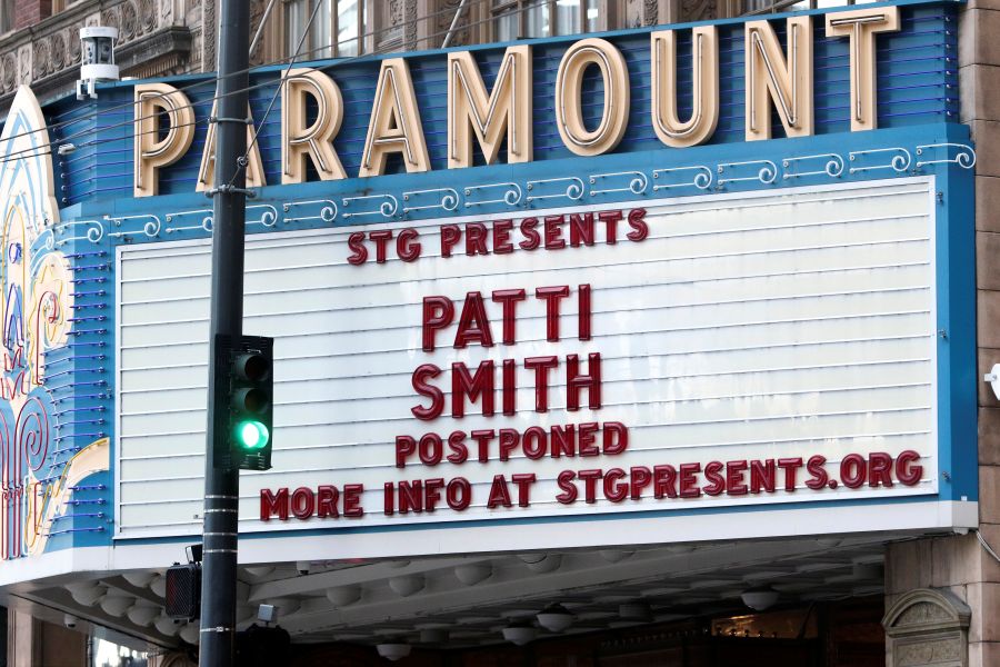 A marque announcing a postponed Patti Smith show is pictured at the Paramount Theater after Washington Governor Jay Inslee issued an order to cancel or postpone gatherings of 250 or more in Seattle, Washington,