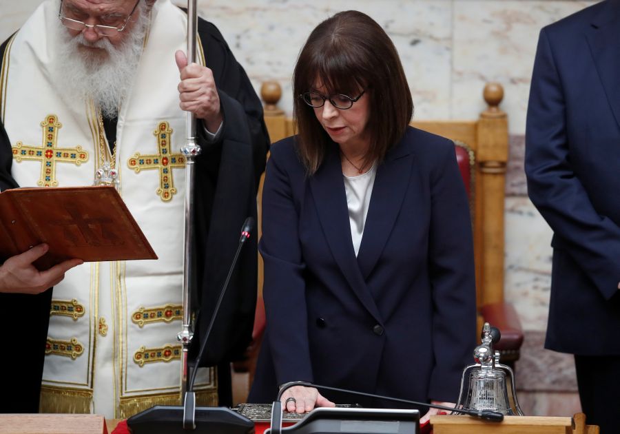 Newly elected Greek President Katerina Sakellaropoulou takes an oath during the swearing-in ceremony at the parliament in Athens, Greece on March 13. (REUTERS Photo)