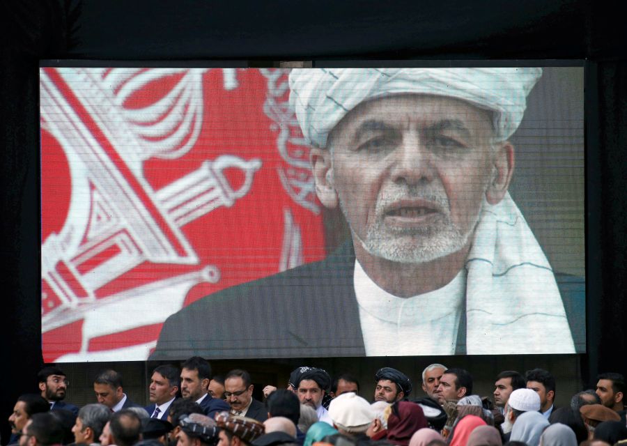 A screen shows the broadcast of Afghanistan's President Ashraf Ghani speaking during his inauguration as president, in Kabul, Afghanistan on March 9. (REUTERS Photo)