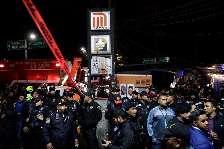 Police officers and onlookers stand outside the Tacubaya metro station, after several people were injured when two trains collided in the underground metro network, in Mexico City, Mexico on March 11. (REUTERS