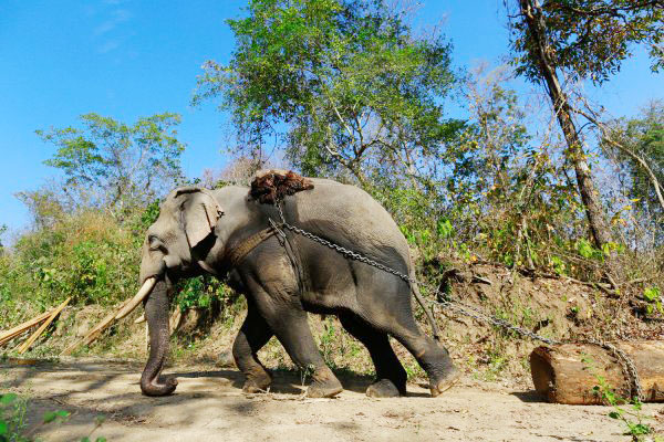 An elephant pulls a teak log at a logging camp in Pinlebu township, Sagaing division in northern Myanmar on March 6, 2014. (REUTERS File Photo)