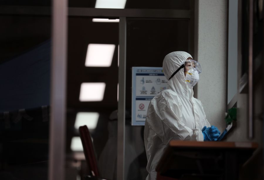A medical worker wearing protective gear looks out from a window at a hospital in Busan, South Korea on February 26. (REUTERS Photo)