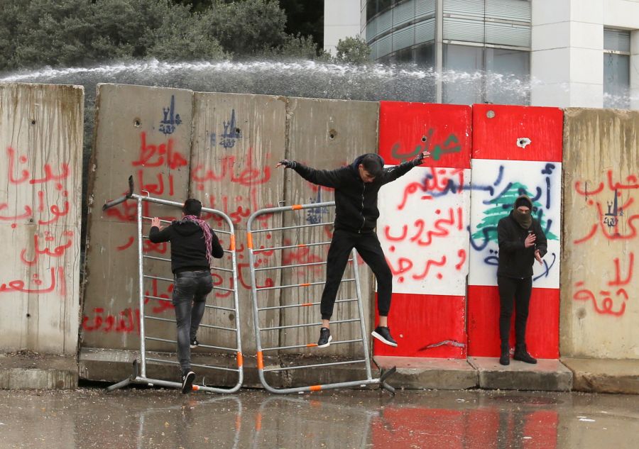 Demonstrators are sprayed with a water cannon during a protest seeking to prevent MPs and government officials from reaching the parliament for a vote of confidence, in Beirut, Lebanon on February 11. (REUTERS