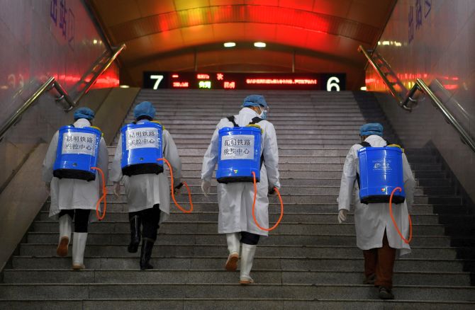 Workers with sanitizing equipment walk up a flight of stairs as they disinfect a railway station while the country is hit by an outbreak of the new coronavirus, in Kunming, Yunnan province, China February 4, 20