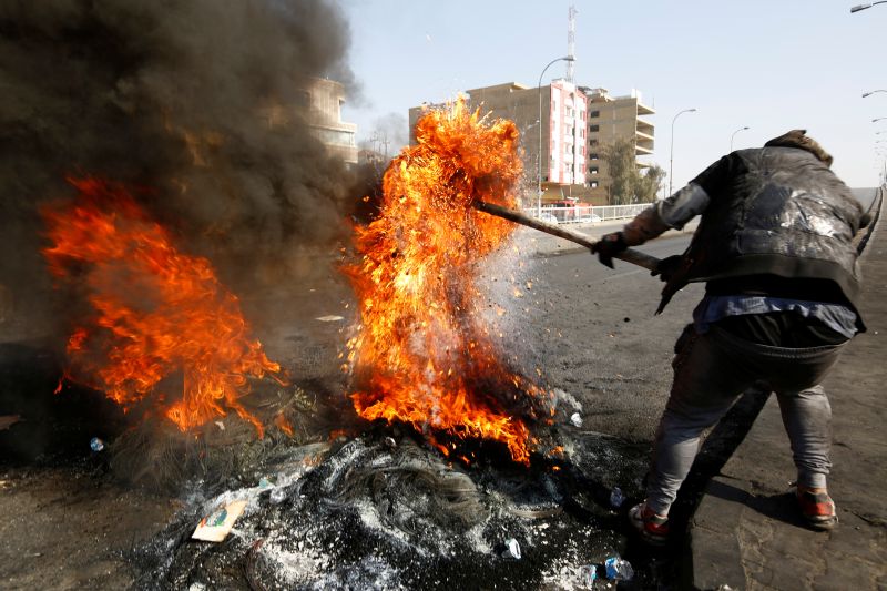 An Iraqi demonstrator burns tires to block a road during ongoing anti-government protests in Najaf, Iraq February 5, 2020. REUTERS/Alaa al-Marjani