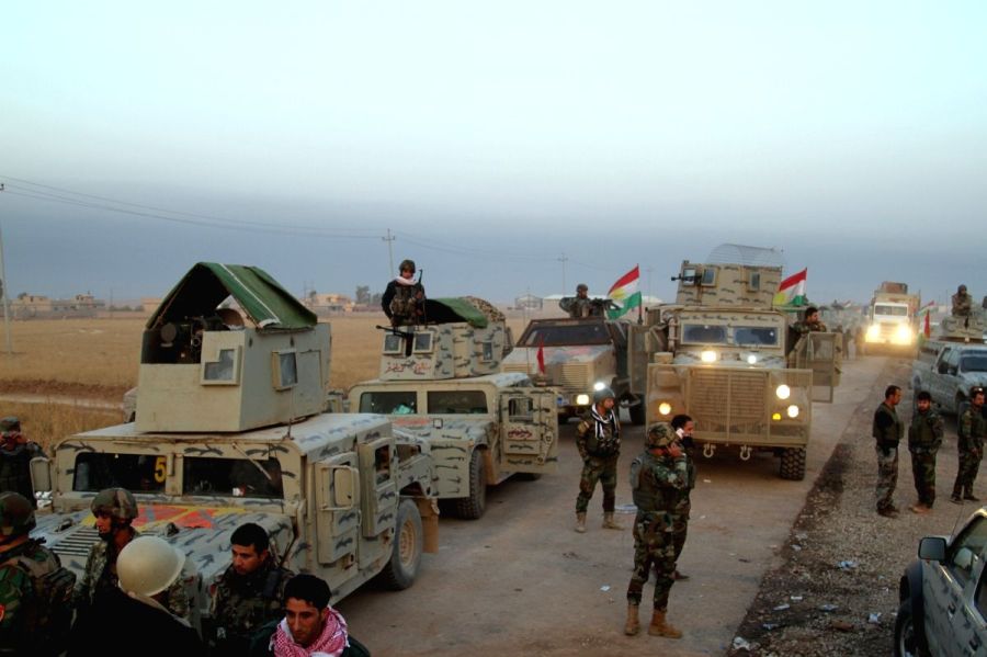 Kurdish security forces, known as Peshmerga, assemble outside the town of Bashiqah, some 30 km northeast of Mosul, Iraq on November 7, 2016. (IANS File Photo)