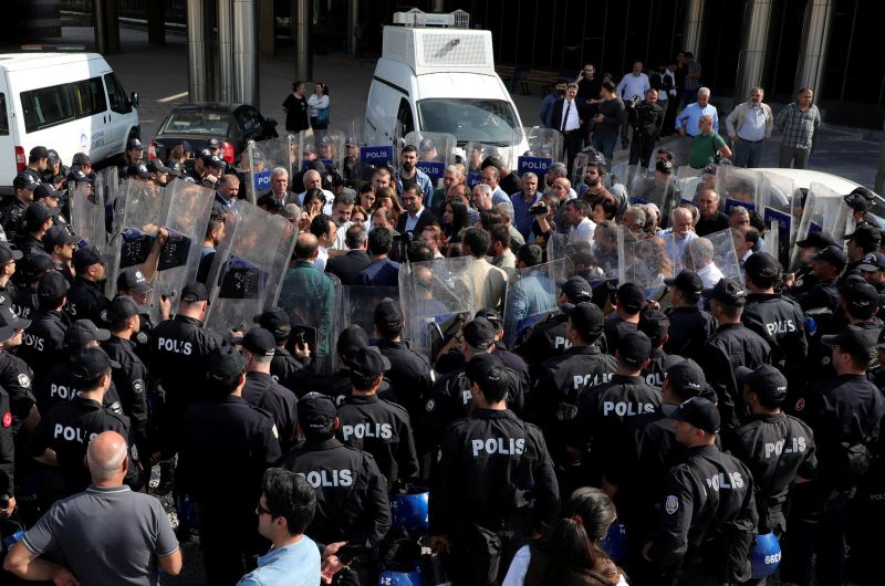Pro-Kurdish Peoples' Democratic Party (HDP) lawmakers are surrounded by riot police as they protest against detention of their local politicians in Diyarbakir, Turkey on October 21, 2019. (REUTERS Pho