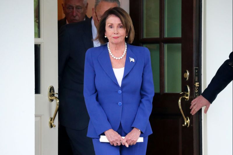 U.S. House Speaker Nancy Pelosi (D-CA) walks out with Senate Minority Leader Chuck Schumer (D-NY) and House Majority Leader Steny Hoyer (D-MD) to speak with reporters after meeting with President Trump at the W