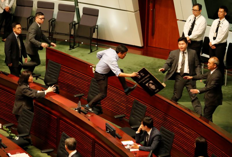 A lawmaker jumps on furniture as he tries to follow Hong Kong's Chief Executive Carrie Lam (not pictured), as Lam leaves the Legislative Council in Hong Kong, China on October 17. (REUTERS Photo)