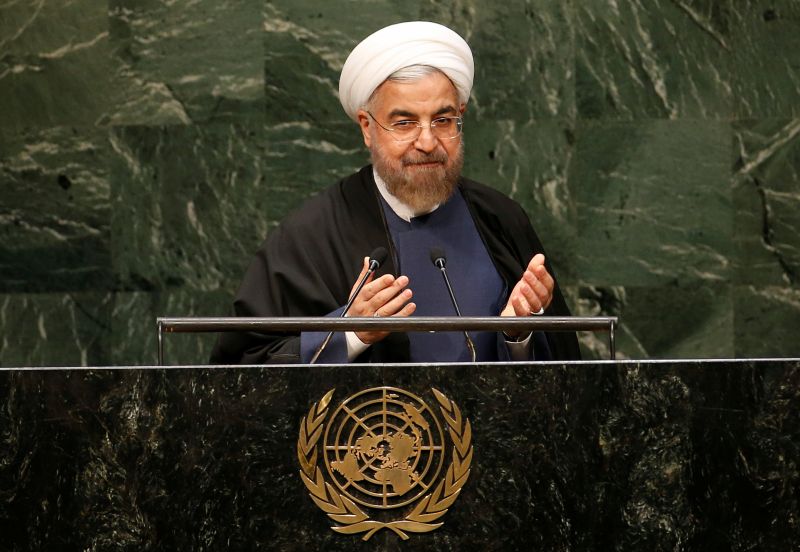 Iranian President Hassan Rouhani gestures at the conclusion of his address to the 69th United Nations General Assembly at the United Nations Headquarters in New York on September 25, 2014. Rouhani bl