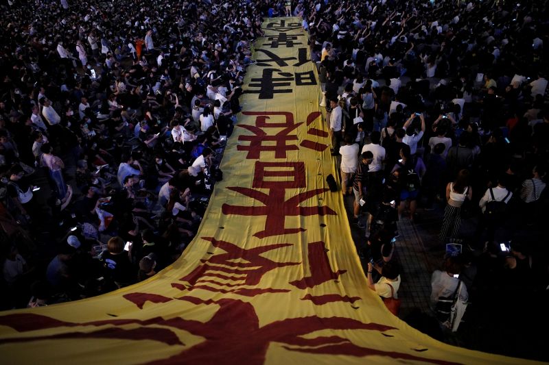 Anti-government protesters gather around a banner as they attend a rally at Edinburgh Place to show solidarity for arrested political activists being held at San Uk Ling detention center in Hong Kong, China on